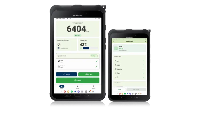 The app runs on tablets and smartphones and is installed inside the tractor cab. It connects wirelessly to the DG400 ECU, automatically recording harvest weight, date, and time for every load.